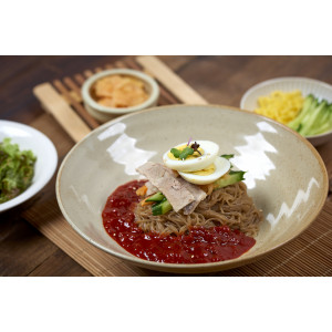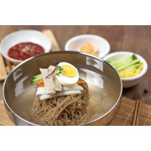 연미색의 양파냉면은 면발이 아주 부드럽고 쫄깃쫄깃하여