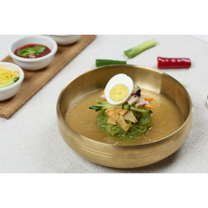 녹차(국산)에 함유되어 있는 생식 성분을 메밀가루에 배합하여 만든 냉면으로